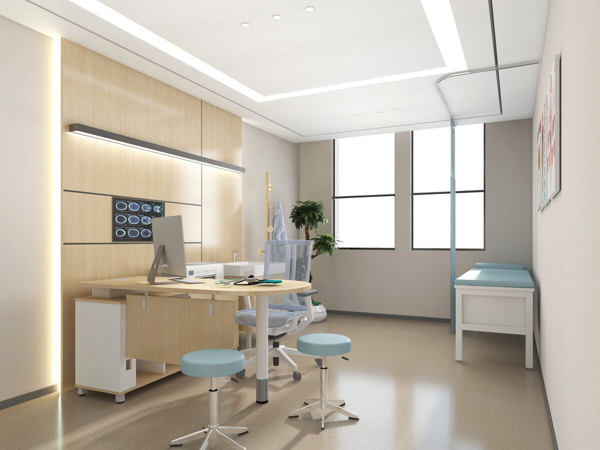 医生办公桌是咨询和记录工作的空间。它通常包括医疗诊断工具存放、医用电脑主机的配置、打印机、医用观片灯的配置等,患者档案的存储空间,以确保为患者护理提供一个功能齐全、井然有序的环境。