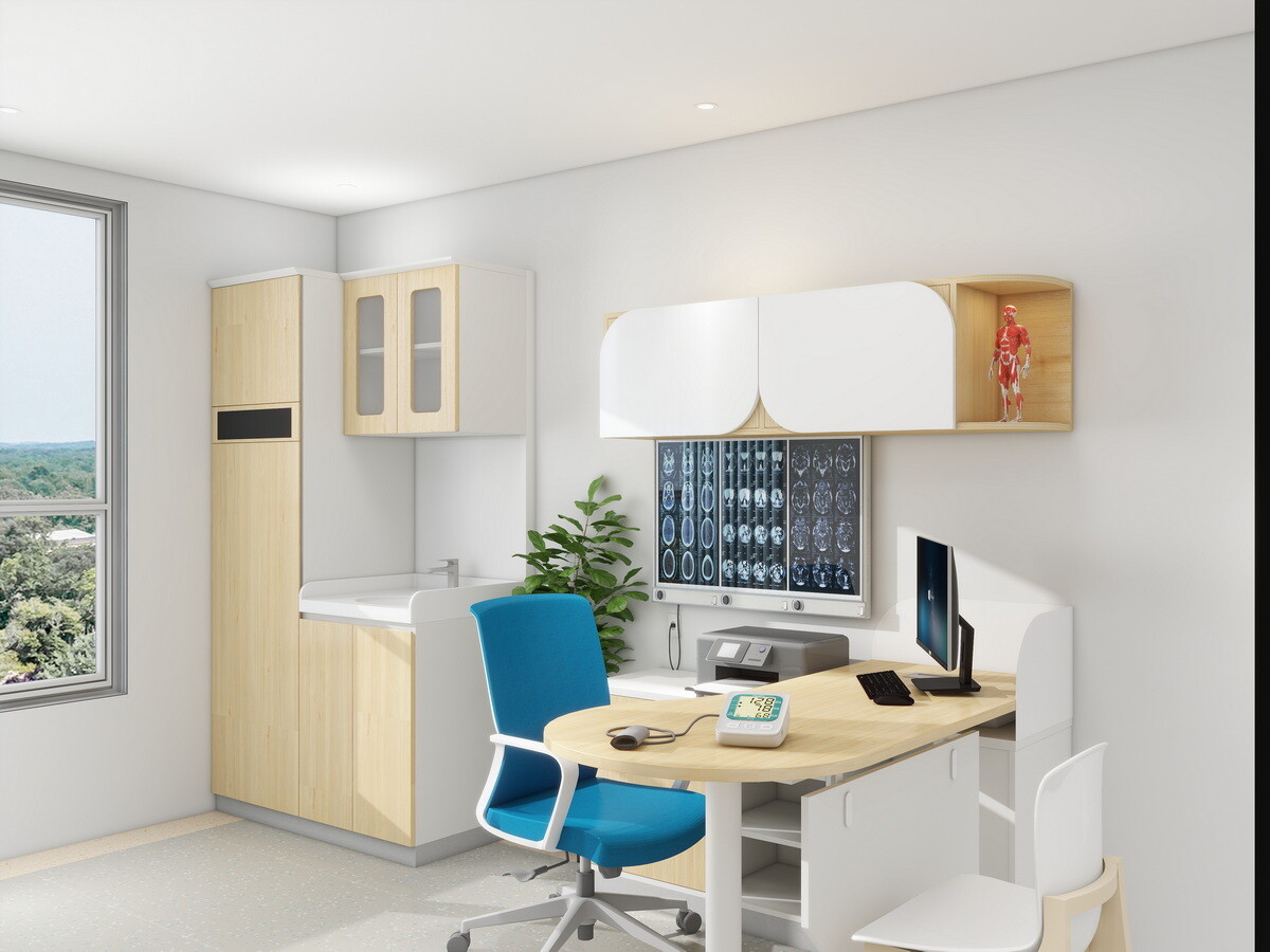 医生办公桌是咨询和记录工作的空间。它通常包括医疗诊断工具存放、医用电脑主机的配置、打印机、医用观片灯的配置等,患者档案的存储空间,以确保为患者护理提供一个功能齐全、井然有序的环境。