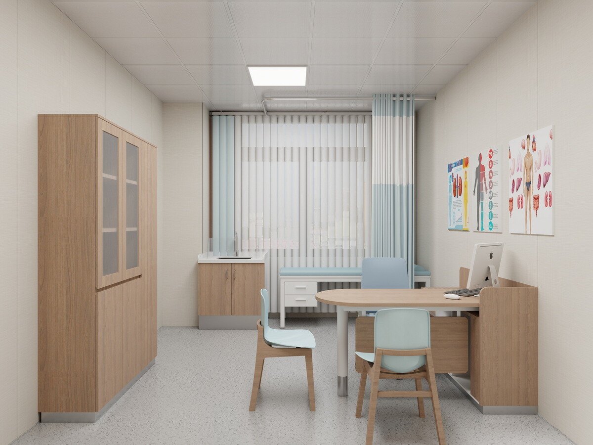 医生办公桌是咨询和记录工作的空间。它通常包括医疗诊断工具存放、医用电脑主机的配置、打印机、医用观片灯的配置等,患者档案的存储空间,以确保为患者护理提供一个功能齐全、井然有序的环境。